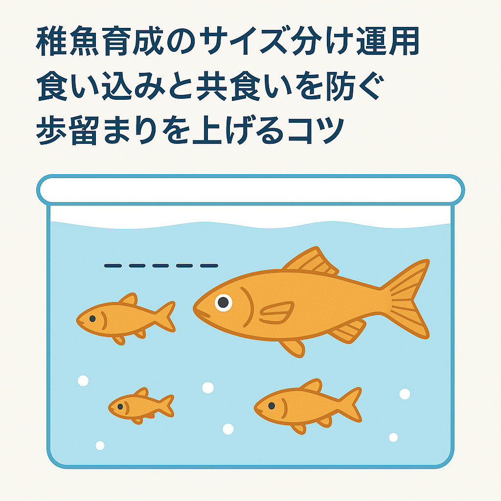 夏の管理 稚魚育成のサイズ分け運用|食い込みと共食いを防ぎ歩留まりを上げるコツ メダカ稚魚のサイズ分け運用。7〜10日ごとに小/中/大へ分け、餌をパウダー→微粒→粒に段階移行。密度と換水で共食いとロスを防止。 2025.09.06 夏の管理秋の管理飼育方法