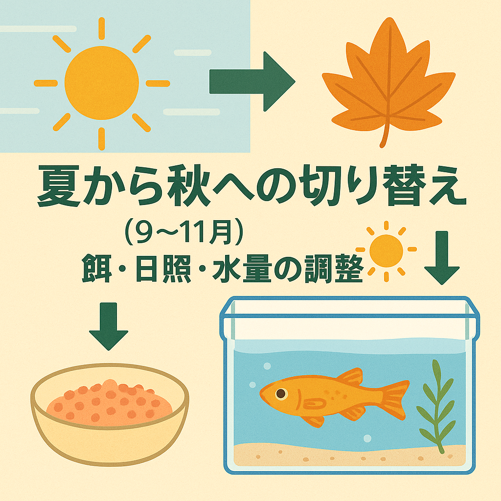 秋の管理 秋の移行期の運用|夏から秋への切り替え(9〜11月)餌・日照・水量の調整 メダカの秋運用。給餌回数を徐々に減らし、午前日光+午後日陰、水量多めで温度のブレを抑制。台風週の水位調整と越冬準備まで。 2025.09.06 秋の管理飼育方法