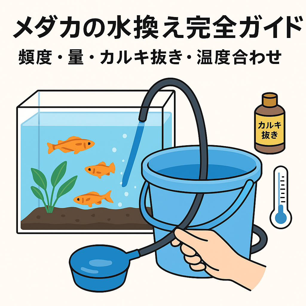 飼育方法 メダカの水換え完全ガイド|頻度・量・カルキ抜き・温度合わせのコツ メダカの水換え完全ガイド。頻度と量の目安、カルキ抜き、同温注水、室内/屋外の違いを詳述。やりすぎや急変を防ぐ安全な手順を解説。 2025.09.09 飼育方法
