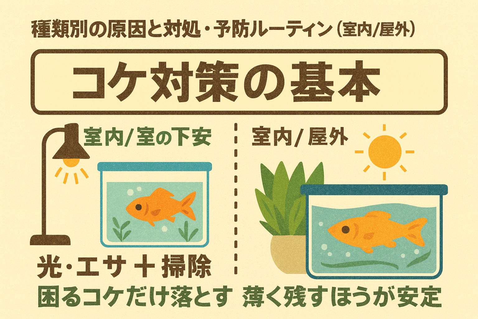 飼育方法 コケ対策の基本|種類別の原因と対処・予防ルーティン(室内/屋外) メダカ飼育のコケ対策。光・栄養・掃除の三本柱で過剰なコケを狙い撃ち。種類別の原因と対処、週1の予防ルーティンを紹介。 2025.09.09 飼育方法