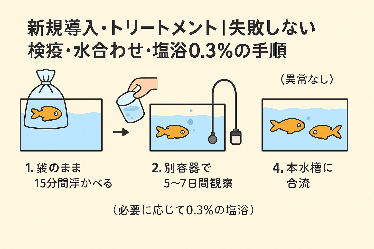飼育方法 新規導入・トリートメント|失敗しない検疫・水合わせ・塩浴0.3%の手順 メダカの新規導入とトリートメント。温度合わせ15分→水合わせ30〜45分→別容器で5〜7日観察。必要時は塩浴0.3%で安全に合流。 2025.09.09 飼育方法