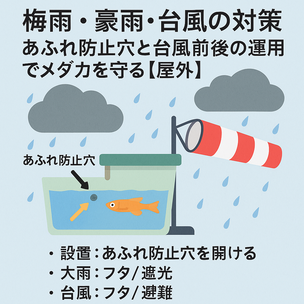 飼育方法 梅雨・豪雨・台風の対策|あふれ防止穴と台風前後の運用でメダカを守る【屋外】 メダカの梅雨・豪雨・台風対策。縁から2〜3cm下のあふれ防止穴、水位調整と固定、翌日の1/3換水で急変を防ぐ実践手順を解説。 2025.09.09 飼育方法