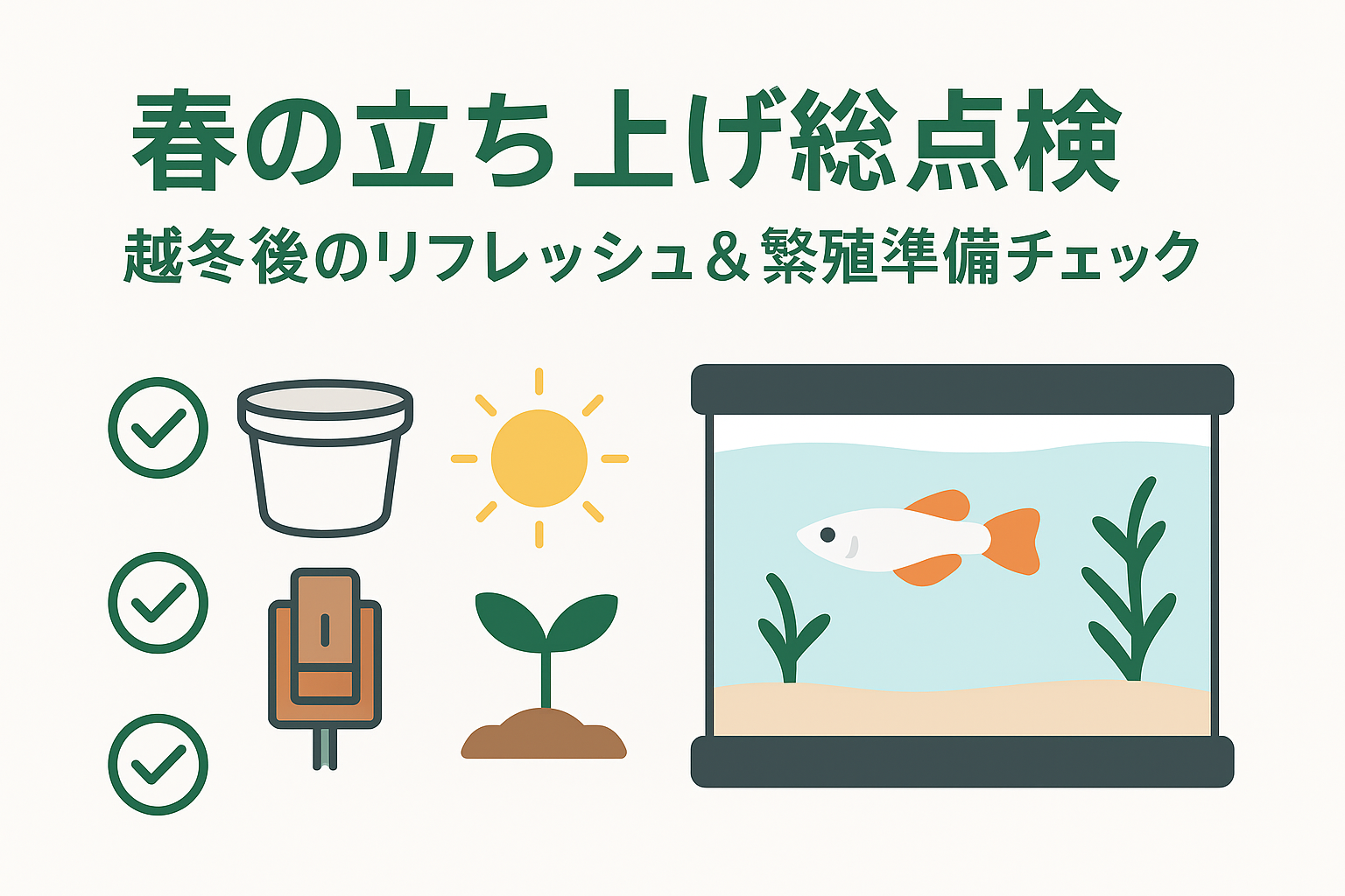 春の管理 春の立ち上げ総点検|越冬後のリフレッシュと繁殖準備のチェックリスト メダカの春立ち上げ総点検。晴れた日中の1/4換水から始め、2週間で水を整える。スポンジF再開、照明12〜14h、親選別と産卵床準備。 2025.09.09 春の管理飼育方法